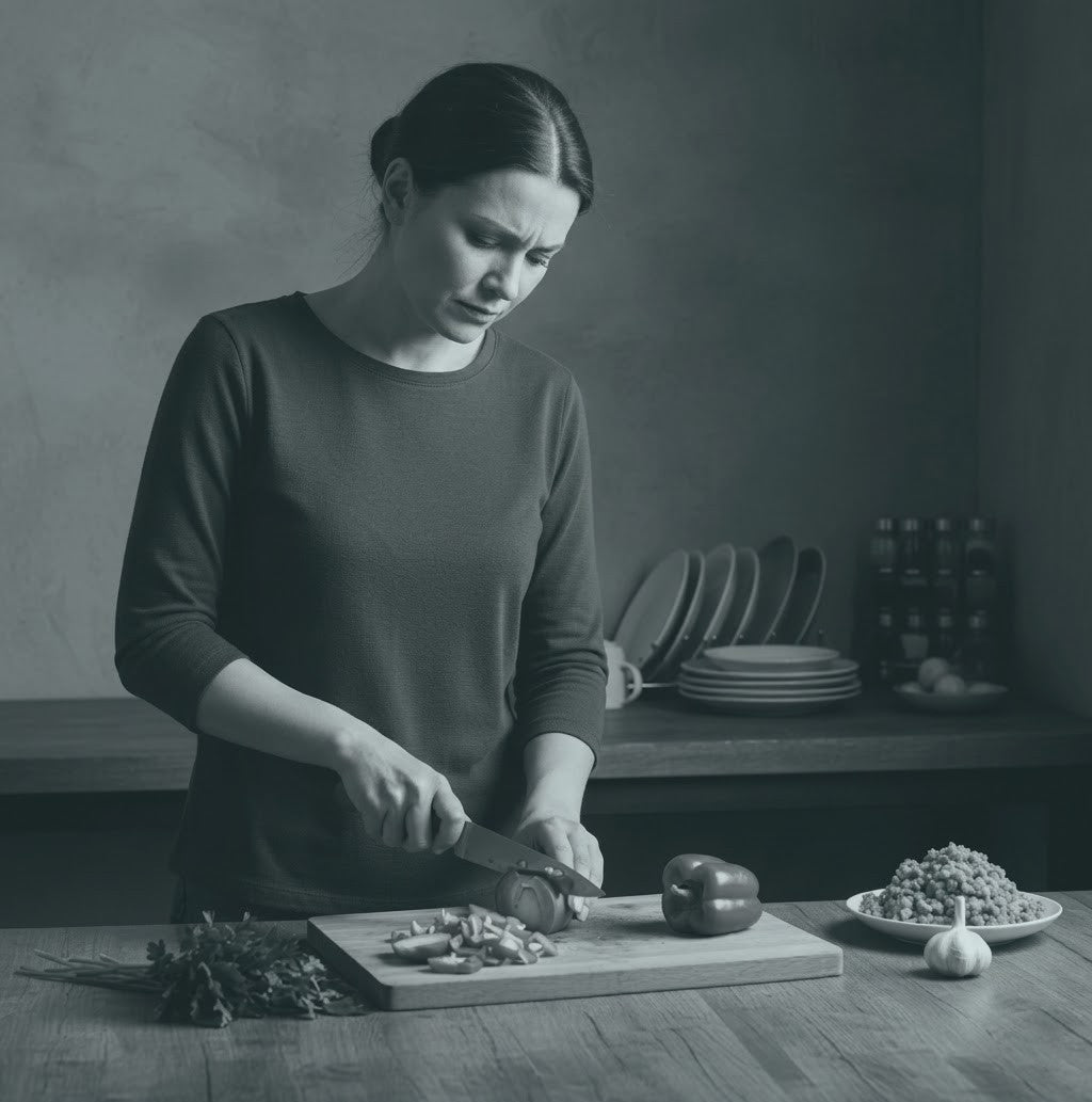 El cansancio de siempre: 30 minutos picando a mano, ojos llorosos por la cebolla y el riesgo de cortarte. Un esfuerzo agotador que te quita tiempo valioso con tu familia.